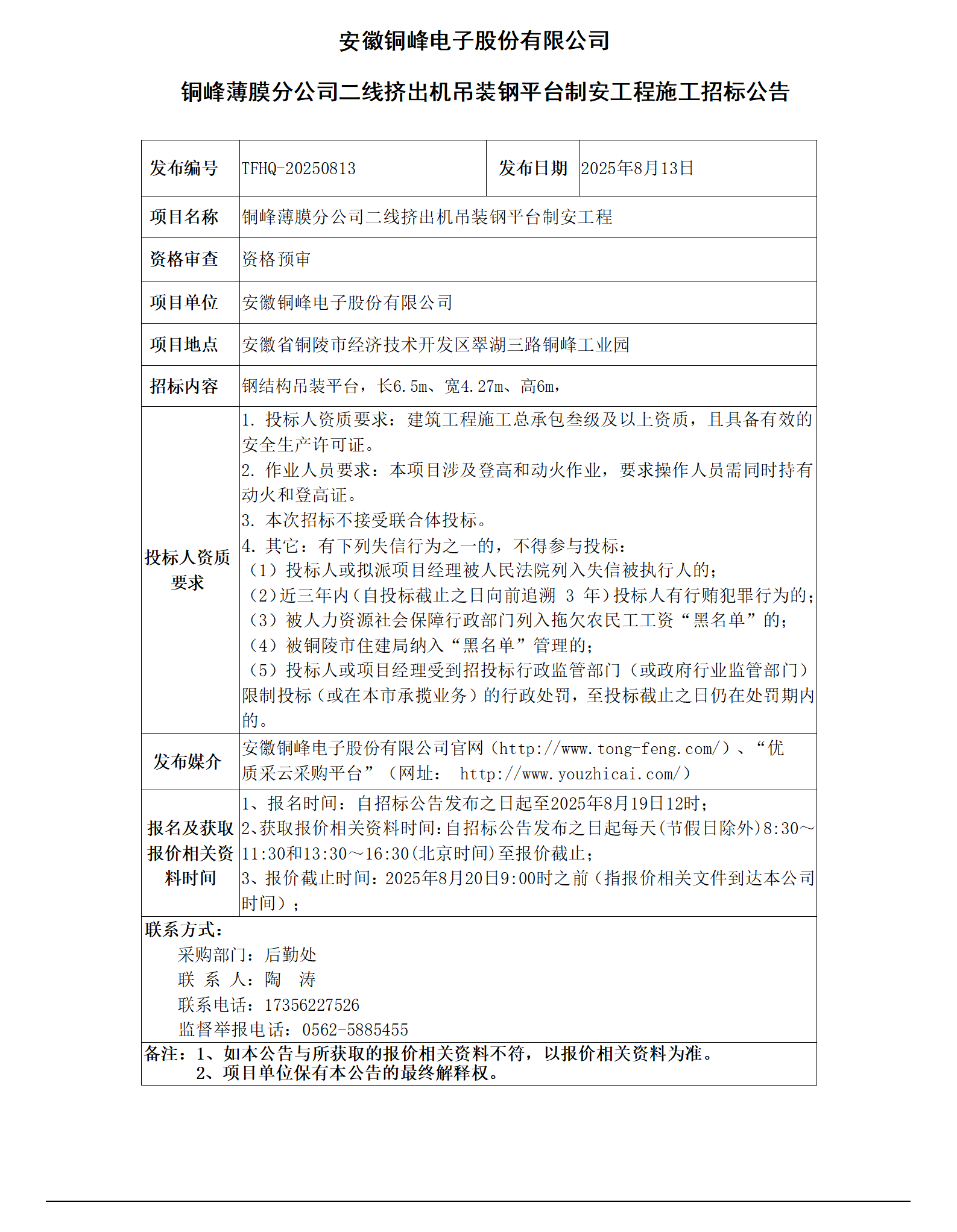 英国威廉希尔公司官网 (英国威廉希尔公司官网薄膜分公司二线挤出机吊装钢平台制安工程招标公告)_01