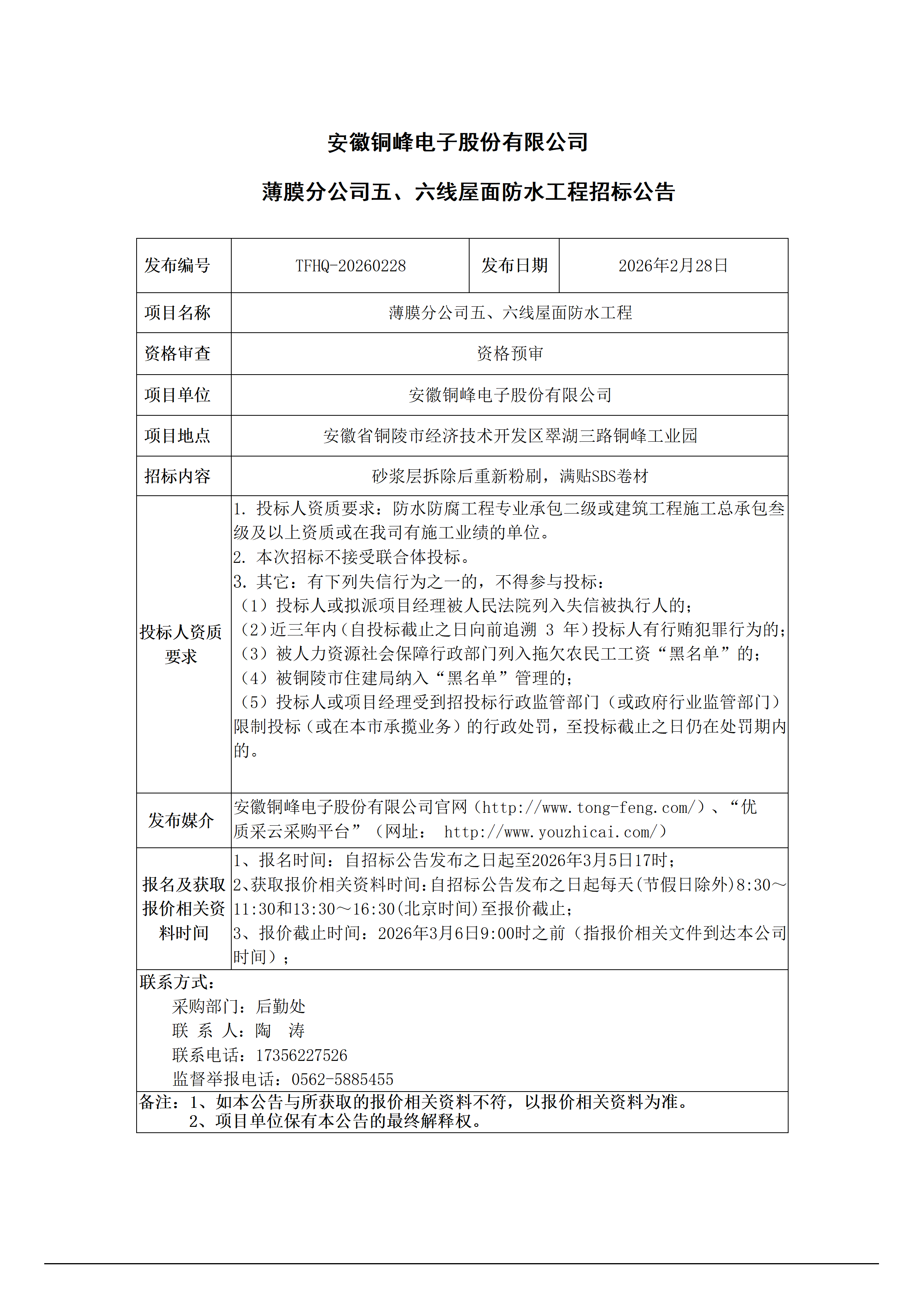 01英国威廉希尔公司官网 (薄膜分公司五、六线屋面防水工程 招标公告)_01